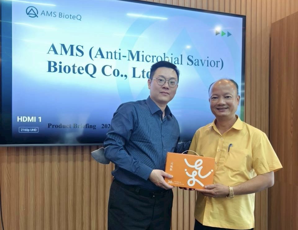 元樟生技董事長手持自家產品元氣飲與天農集團執行長合影